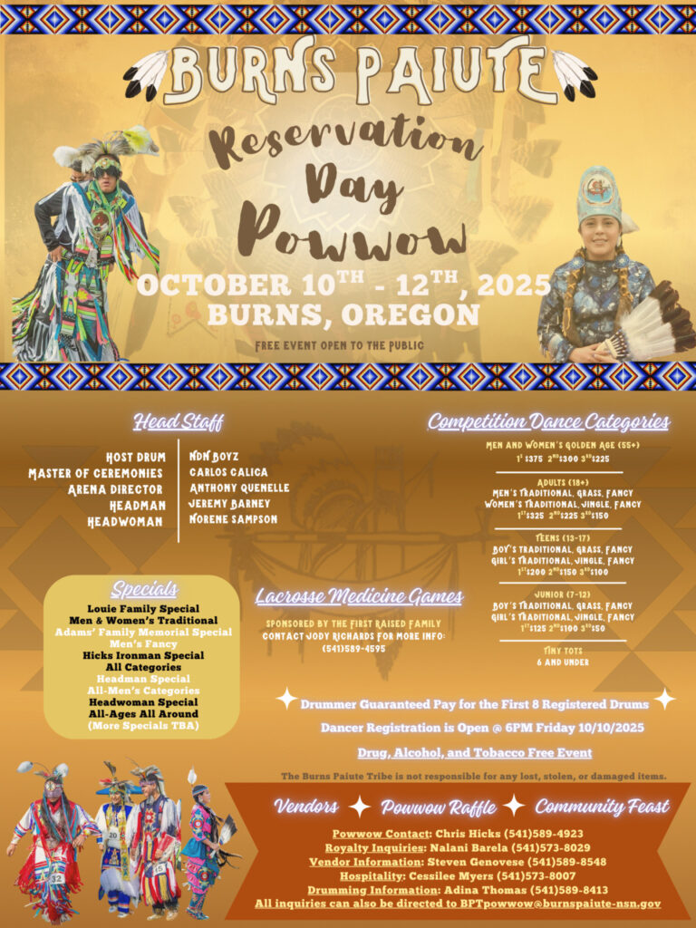 Interested in joining us?VENDOR COSTS ARE AS FOLLOWSHot Food & Beverage Vendors (requiring electricity and a table): $100/full three-day event, $75/Saturday onlyAll Other Vendors: $50/full eventTable Rentals will be available at $40 deposit, to be refunded at the close of the eventPLEASE FILL OUT THE FORM BELOW AND SUBMIT IT!2025 RESERVATION DAY POWWOWVENDORS!